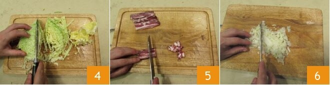 Schneiden Sie das Gemüse in feine Streifen 4 und legen Sie es beiseite. Schneiden Sie den Speck zunächst in Streifen und dann in Würfel 5 und legen Sie ihn ebenfalls beiseite. Nachdem Sie die Zwiebel geschält haben, hacken Sie sie sehr fein 6.