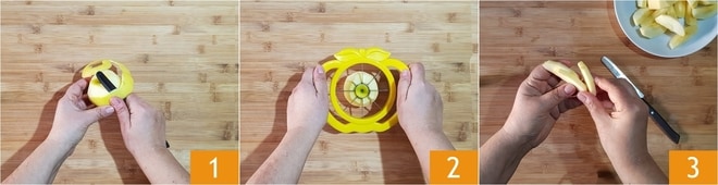 Um den Ricotta-Apfelkuchen zuzubereiten, beginnt ihr mit den Äpfeln. Wascht sie gut, schält sie 1 und teilt die Äpfel mit einem speziellen Werkzeug in 8 Spalten, wobei ihr gleichzeitig das Kerngehäuse entfernt 2. Jetzt schneidet ihr jede Spalte in zwei oder drei Scheiben mit einer Dicke von 1-1,5 cm 3.