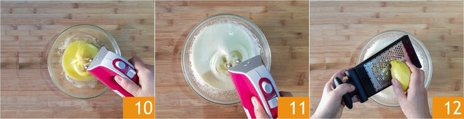 Schlagt die Masse mit einem elektrischen Handmixer 10, bis sie hell und schaumig ist 11. Fügt dann die abgeriebene Zitronenschale hinzu 12.