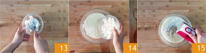 Nehmt den Ricotta und rührt ihn mit einer Gabel kurz durch, um ihn geschmeidig zu machen 13. Gebt ihn zum Teig hinzu und mischt ihn mit dem Handmixer auf niedrigster Stufe 15 unter.