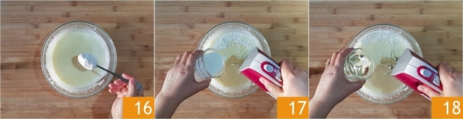 Gebt nach und nach die trockenen Zutaten hinzu 16, abwechselnd mit Milch 17 und Öl 18, bis alle Zutaten verbraucht sind.