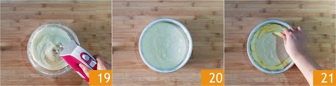 Ihr solltet eine glatte und klumpenfreie Masse erhalten 19. Gebt sie in eine mit Backpapier ausgelegte Form von 18-20 cm 20. Legt die Apfelscheiben von außen nach innen auf den Teig 21.