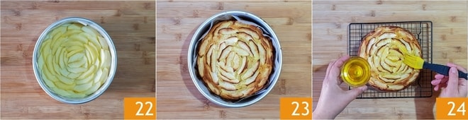 Ordnet sie strahlenförmig an, leicht überlappend und arbeitet euch nach innen vor, bis alles vollständig bedeckt ist 22. Backt den Kuchen in einem auf 175 °C vorgeheizten statischen Ofen für etwa eine Stunde auf der mittleren Schiene. Macht immer den Stäbchentest, bevor ihr den Kuchen herausnehmt. Nehmt den Kuchen heraus 23 und lasst ihn abkühlen, bevor ihr ihn aus der Form löst. Erwärmt dann leicht den Honig und verwendet ihn, um den Kuchen zu bestreichen, damit er glänzt 24.