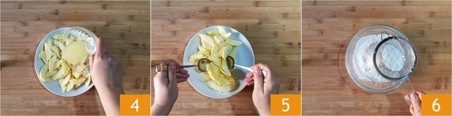Gebt die Apfelscheiben nach und nach in einen Teller und gießt den Saft einer Zitrone darüber 4. Gut mischen 5 und beiseite stellen, so dass sie nicht braun werden. Siebt das Mehl in eine Schüssel 6.