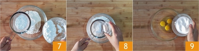 Siebt dann auch die Maisstärke 7 und das Backpulver 8 hinzu. Vermischt alles und stellt es beiseite. Brecht die Eier in eine große Schüssel und gebt den Zucker hinzu 9.