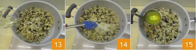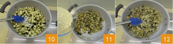 umrühren 10 und etwa 4 Minuten weitergaren, immer bei niedriger Hitze. Dann den Reis hinzufügen 11 und gut umrühren, um ihn mit den Auberginen zu rösten 12.