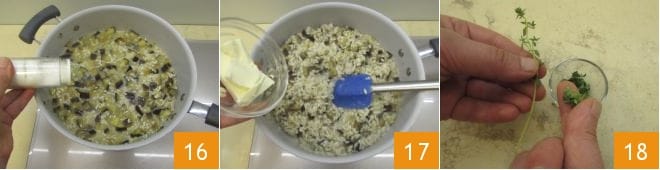 Wenn der Reis gar ist, eine Prise Salz hinzufügen 16: Achten Sie darauf, nicht zu viel hinzuzufügen, da die Brühe bereits salzig ist. Nun können Sie die Hitze ausschalten und die Butter hinzufügen 17, einige Minuten unter Rühren cremig werden lassen. In der Zwischenzeit die Thymianzweige abzupfen 18