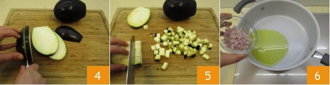 Um das Risotto mit Auberginen zuzubereiten, beginnen Sie damit, die Gemüsebrühe heiß zuzubereiten. Alternativ können Sie Wasser verwenden, aber mit der Gemüsebrühe wird das Risotto schmackhafter. Dann machen Sie mit der Zubereitung des Soffritto weiter: Schälen Sie die Schalotte 1, hacken Sie sie mit einem Messer 2 und legen Sie sie beiseite. Dann sind die Auberginen dran: Nach dem Waschen entfernen Sie die Enden 3