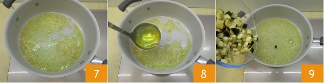Die Schalotte bei niedriger Hitze 4-5 Minuten lang dünsten 7, dabei gelegentlich umrühren, damit sie nicht anhaftet. Dann mit einer Schöpfkelle heißer Brühe ablöschen 8 und Ihr Soffritto weitere 10 Minuten köcheln lassen. Nach dieser Zeit die Auberginenwürfel hinzufügen 9