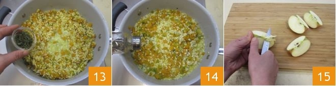 Gebt die gehackten Zutaten zu dem kochenden Risotto 13. Mit Salz und Pfeffer abschmecken 14. Nehmt nun die Äpfel: wascht und trocknet sie gut, dann halbiert und in Scheiben schneiden, dabei das Kerngehäuse entfernen 15. Es ist nicht notwendig, die Schale zu entfernen, da sie der Zubereitung Farbe verleiht. Falls gewünscht, kann sie jedoch entfernt werden.