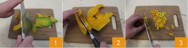 Um das Risotto mit Äpfeln, würzigem Kürbis und Salbei zuzubereiten, beginnt mit der Zubereitung der Gemüsebrühe. Dann widmet euch der Reinigung des Kürbisses: Schneidet ihn in Viertel und entfernt die äußere Schale 1. Schneidet ihn dann in Scheiben 2, um ihn leichter in 1 cm große Würfel zu schneiden 3.