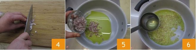 Dann schält und hackt die Schalotte fein 4. Erhitzt einen Topf mit einem Schuss Öl und bratet die Schalotte 5 für etwa 5-6 Minuten an, während ihr sie ständig rührt. Ihr könnt mit der Gemüsebrühe ablöschen, um das Garen zu erleichtern 6.