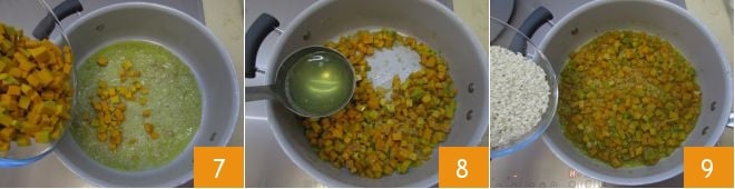 Fügt den Kürbis hinzu 7 und löscht mit einer Kelle Brühe ab 8: Das Garen dauert etwa 15 Minuten bei schwacher Hitze, gelegentlich umrühren. Wenn die Brühe aufgenommen ist, fügt den Reis hinzu 9 und lasst ihn etwa 1 Minute anrösten.