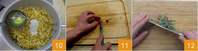 Fügt dann nach und nach Gemüsebrühe hinzu, während sie aufgenommen wird, um den Reis zu kochen 10: Das dauert etwa 20 Minuten. Während der Reis kocht, schneidet eine Chilischote ein und entfernt die inneren Samen 11, dann schneidet sie in dünne Streifen zusammen mit dem gewaschenen Salbei 12.