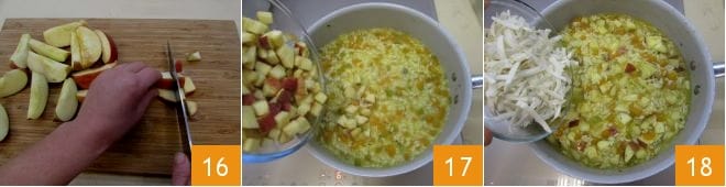 Schneidet die Apfelscheiben in etwa 2 cm große Würfel 16. Wenn noch 5-6 Minuten bis zum Ende der Garzeit des Risottos fehlen, fügt die Äpfel hinzu 17 und vermischt die Zutaten gut. Fügt weiterhin die restliche Brühe hinzu. Am Ende der Garzeit den Herd ausschalten und den geriebenen gesalzenen Ricotta hinzufügen 18.