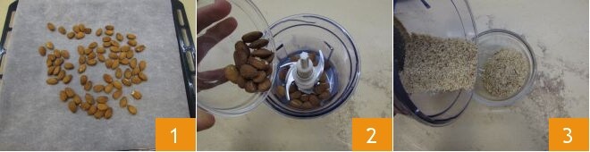 Um die Roccocò zuzubereiten, beginnen Sie mit dem Rösten der Mandeln mit der Schale. Dazu legen Sie sie einfach auf ein Backblech und rösten sie im vorgeheizten Ofen bei 180 °C für 5 Minuten 1. Sobald sie geröstet sind, nehmen Sie sie aus dem Ofen, lassen sie kurz abkühlen und geben dann 50 Gramm in eine Küchenmaschine 2 und mahlen sie zu einer sandigen Masse; den Rest beiseite legen 3.