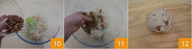 Fügen Sie die gewürfelten Zitronen zusammen mit 50 Gramm ganzen Mandeln hinzu 10, mischen Sie diese in den Teig und geben Sie dann alles auf die Arbeitsfläche 11. Kneten Sie weiter, bis ein glatter Teig entsteht 12.