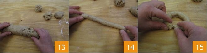 Arbeiten Sie den Teig mit den Händen, bis Sie eine Rolle 13 erhalten, aus der Sie 11 Stücke zu je etwa 75 Gramm erhalten, indem Sie sie einfach mit den Händen abtrennen, um die Unversehrtheit der ganzen Mandeln zu bewahren. Aus den Stücken machen Sie etwa 20 Zentimeter lange Stangen 14, dann verbinden Sie die Enden 15, um einen Kringel zu formen.