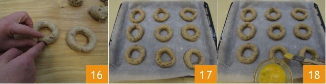 Drücken Sie mit den Fingern die beiden Enden zusammen, um sie zu versiegeln, damit sie während des Backens ihre Form behalten 16. Legen Sie die Kringel auf ein mit Backpapier belegtes Backblech 17 und bestreichen Sie die Oberfläche mit leicht geschlagenem Ei 18. Wenn Sie die optionalen 30 Gramm Mandeln zur Dekoration der Oberfläche hinzufügen möchten, können Sie dies jetzt tun, nachdem Sie die Kringel bestrichen haben.