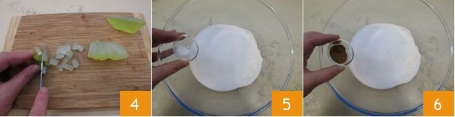 Schneiden Sie die kandierten Zitronen in Würfel 4 und widmen Sie sich dem Teig: In einer Schüssel das Mehl 00 mit dem Zucker und dem Natron vermischen (wenn Sie das traditionelle Rezept einhalten möchten, verwenden Sie in den gleichen Mengen Ammoniumkarbonat statt Natron) 5, dann die angegebene Gewürzmischung (oder gemäß dem traditionellen Rezept, den Pisto) hinzufügen 6.