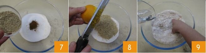 und die gehackten Mandeln 7. Die Schale von ¼ Orange abreiben 8 und unter Zugabe von Wasser bei Raumtemperatur nach und nach 9 einen sehr festen und trockenen Teig kneten.