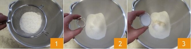 Um die salzige Brioche zuzubereiten, beginnen Sie damit, alle Zutaten abzuwiegen, sie sollten alle die gleiche Temperatur haben. An diesem Punkt sieben Sie das Mehl in die Schüssel einer Küchenmaschine 1, fügen Sie die Trockenhefe 2 und den Zucker 3 hinzu.