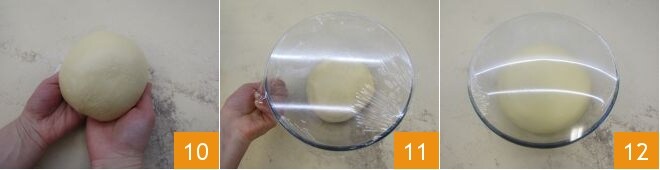 Formen Sie nun eine Kugel 10 und legen Sie den Teig in eine große Schüssel. Decken Sie ihn mit Frischhaltefolie ab und lassen Sie ihn etwa 3 Stunden im ausgeschalteten Ofen mit nur eingeschaltetem Licht gehen. Wenn Sie keine Folie verwenden möchten, können Sie den Teig auf ein Schneidebrett geben und mit einer umgedrehten großen Schüssel abdecken: Sie müssen jedoch verhindern, dass Luft an den Teig gelangt, da sich sonst eine Kruste bildet. Sobald er sein Volumen verdoppelt hat 12