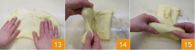 übertragen Sie ihn erneut auf eine leicht bemehlte Arbeitsfläche und drücken Sie ihn mit den Händen vorsichtig flach 13. Klappen Sie nun beide seitlichen Enden zur Mitte hin 14 und beginnen Sie, ihn aufzurollen 15