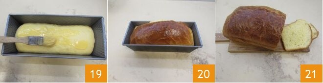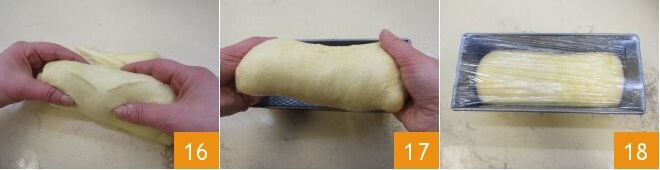 bis Sie einen Strang 16 von der gleichen Länge wie die Form erhalten. Fetten Sie dann eine Form von 26x11 cm ein und geben Sie den Teig hinein 17, decken Sie ihn erneut mit Frischhaltefolie ab 18 (Sie können sich entscheiden, nicht mit Folie zu bedecken, sondern mit einem Tuch. Die Folie dient natürlich dazu, das Eindringen von Luft zu vermeiden. Lassen Sie ihn eine weitere Stunde im ausgeschalteten Ofen mit nur eingeschaltetem Licht gehen.