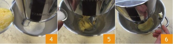 Schlagen Sie die Eier in einer Schüssel, schalten Sie dann die Küchenmaschine mit einem Rührbesen auf mittlerer Geschwindigkeit ein und gießen Sie die Eier nach und nach hinzu 4. Sobald sie gut vermischt sind, wechseln Sie den Rührbesen mit dem Knethaken, fügen Sie das Salz 5 hinzu und dann die weiche Butter stückweise 6, wobei Sie warten, bis diese absorbiert ist, bevor Sie mit einem weiteren Stück fortfahren.