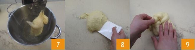 Sobald Sie die gesamte Butter hinzugefügt haben, arbeiten Sie die Masse etwa 20 Minuten lang, bis sie gut verbunden ist 7. Sie erhalten einen ziemlich feuchten Teig, und es wird nicht notwendig sein, zusätzliches Mehl hinzuzufügen. Mit einem Teigschaber helfen Sie sich, den Teig auf eine Arbeitsfläche zu übertragen, fetten Sie sich leicht die Hände ein und geben Sie dem Teig einige Verstärkungsfalten, indem Sie den Teig von außen nach innen falten 9.