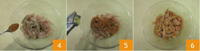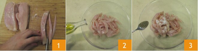Um das Sandwich mit würzigem Huhn und Rote Bete zuzubereiten, reinigt zuerst die Hühnerbrust von Knorpel und kleinen Knochen, dann schneidet sie in Streifen von einem halben Zentimeter Dicke 1. Gebt das Huhn in eine Schüssel und würzt es mit dem Öl 2, Salz und Oregano 3.