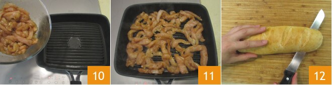 Geht zur Zubereitung des Huhns über: Eine Grillpfanne gut erhitzen, die Hühnerstreifen hinzufügen 10 und etwa 6 Minuten grillen, dabei häufig wenden 11. Das Huhn muss gut durchgegart sein, daher die Kochzeit bei Bedarf verlängern. In der Zwischenzeit die Brötchen längs halbieren 12.