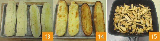 Würzen Sie 2 Scheiben mit Öl und 2 Scheiben mit je 50 g Emmental 13, dann im Grillmodus bei 250° für 4 Minuten oder bis der Käse geschmolzen ist 14. Wenn das Huhn gar ist 15, sind Sie bereit, Ihre Sandwiches zusammenzustellen.