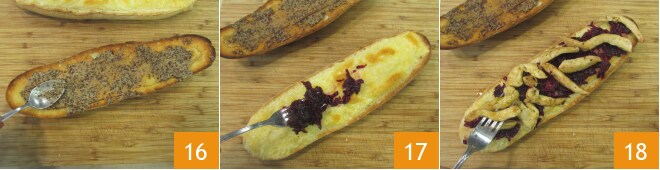 Bestreichen Sie die Brotscheiben ohne Käse mit grobkörnigem Senf 16. Belegen Sie die übrigen Brotscheiben mit der gewürzten Rote Bete 17 und dem würzigen Huhn 18.