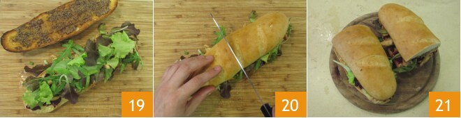 Fügen Sie eine Handvoll gemischten Salat hinzu 19 und schließen Sie die Sandwiches, dann halbieren Sie sie 20. Ihre Sandwiches mit Rote Bete und würzigem Huhn sind bereit, genossen zu werden 21!