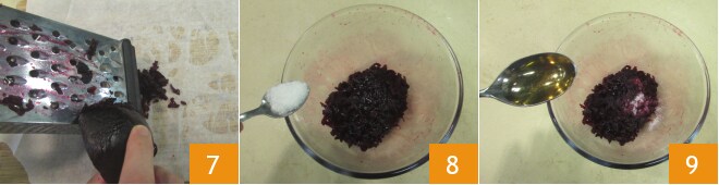 Die vorgekochte Rote Bete mit einer groben Reibe raspeln 7, in eine Schüssel geben und mit Salz 8, Öl und Essig würzen 9. Gut mischen und beiseite stellen.