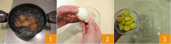 Um die Schokoladen-Canestrelli zuzubereiten, beginnen Sie damit, die Eier zu kochen, um sie hart zu machen: Sie benötigen 8 Minuten in kochendem Wasser 1. Lassen Sie die Eier abtropfen, schälen Sie sie 2 und behalten Sie nur die Eigelbe. Wiegen Sie 70 g Eigelbe ab und geben Sie sie in eine Schüssel 3.