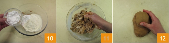Fügen Sie auch das Mehl und die Speisestärke hinzu 10. Kneten Sie den Teig mit den Händen, bis eine homogene Masse entsteht 11, dann übertragen Sie ihn auf eine Arbeitsfläche und bearbeiten Sie ihn noch ein paar Minuten 12.
