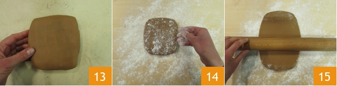 Formen Sie einen Teigball 13, wickeln Sie ihn in Frischhaltefolie und lassen Sie ihn mindestens 30 Minuten im Kühlschrank ruhen. Nach dieser Zeit nehmen Sie den Mürbeteig, legen Sie ihn auf eine bemehlte Arbeitsfläche und bestäuben Sie ihn leicht 14. Rollen Sie den Teig mit einem Nudelholz aus 15, bis er eine Dicke von 4 mm erreicht.
