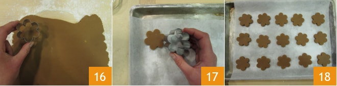 Verwenden Sie einen 5 cm großen Blumen-Ausstecher, um die Kekse auszustechen 16 und legen Sie sie nach und nach auf ein mit Backpapier ausgelegtes Backblech 17. Kneten Sie die Teigreste erneut, rollen Sie sie aus und stechen Sie sie aus, bis der gesamte Teig verbraucht ist 18.