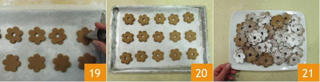 Verwenden Sie eine 1 cm große Tülle, um ein Loch in die Mitte der Kekse zu machen 19. Backen Sie sie im vorgeheizten statischen Ofen bei 180°C auf der mittleren unteren Schiene für 15 Minuten. Nehmen Sie die Schokoladen-Canestrelli aus dem Ofen 20 und lassen Sie sie vollständig abkühlen, bevor Sie sie mit Puderzucker dekorieren und servieren 21.