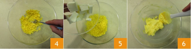 Zerdrücken Sie die Eigelbe mit einer Gabel 4. Hacken Sie die Schokolade und schmelzen Sie sie im Wasserbad oder in der Mikrowelle, dann lassen Sie sie abkühlen. Fügen Sie die weiche Butter zu den Eigelben hinzu 5 und verrühren Sie sie mit einem Gummispatel, bis eine cremige Konsistenz erreicht ist 6.