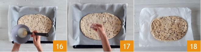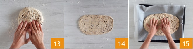 Drücken Sie den Teig erneut mit den Händen flach 13 und formen Sie ein Rechteck von etwa 2 cm Dicke 14. Übertragen Sie den Teig auf ein mit Backpapier ausgelegtes Backblech 15.