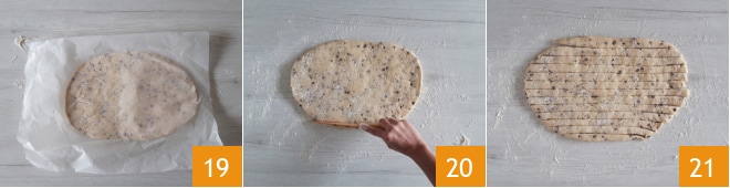 Nach der Gehzeit kippen Sie den Teig vorsichtig auf eine mit Mehl bestäubte Arbeitsfläche 19 und entfernen Sie vorsichtig das Backpapier. Schneiden Sie mit einem glatten Rollmesser etwa 1,5 cm breite Teigstreifen 20 21.