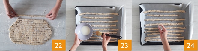 Dehnen Sie vorsichtig jeden Streifen mit den Händen, bis die gewünschte Länge, etwa 30 cm, erreicht ist 22. Legen Sie die Grissini auf ein mit Backpapier ausgelegtes Backblech, wobei Sie sie leicht voneinander absetzen. Bestreichen Sie die Grissini mit Milch 23 und bestreuen Sie sie mit Zucker 24.