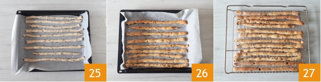 Lassen Sie sie eine weitere Stunde gehen 25. Backen Sie sie in einem vorgeheizten Umluftofen bei 180°C für etwa 20 Minuten. Nehmen Sie die Grissini aus dem Ofen 26 und lassen Sie sie vollständig auf einem Rost abkühlen, bevor Sie sie servieren 27.