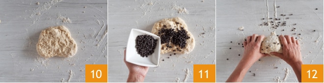 Drücken Sie den Teig ein wenig flach 11, fügen Sie die Schokoladenstückchen hinzu 11 und kneten Sie, bis sie gut vermischt sind 12.