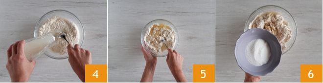 In die Mitte geben Sie die Milch, in der Sie die Hefe aufgelöst haben. Rühren Sie mit einem Löffel um, dann fügen Sie nach und nach die restliche Milch hinzu 4. Zum Schluss geben Sie das Öl dazu 5. Rühren Sie um und fügen Sie auch den Zucker hinzu 6.