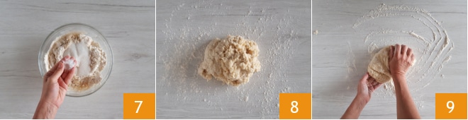 Geben Sie auch das Salz hinzu 7, arbeiten Sie schnell, dann übertragen Sie den Teig auf eine Arbeitsfläche 8 und kneten Sie ihn etwa 10 Minuten lang 10.
